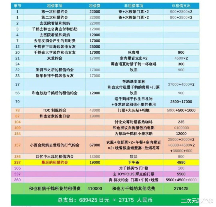 从表格来看,这位网友把漫画里画出来的通盘相干支拨全算了进去,系数是689425日元,折合东谈主民币八成27175元。这内部不光有租出女友的基础工作费,还有两东谈主擅自约聚的沿途支拨、和也主动送的种种擅自礼物,以至连和也听从千鹤的刻薄,租出小墨等其他脚色产生的迤逦用度,开云app王人一并算在了总数里,不错说是算得清澄解析。