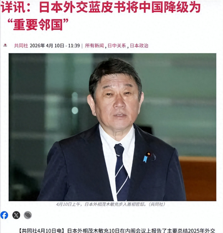 4月10日,高市早苗内阁考究通过2026年版《社交蓝皮书》,干了一件十年未有的大事:把保管了十年的中日"最紧要双边域系"定位,径直砍成了"紧要邻国"。
