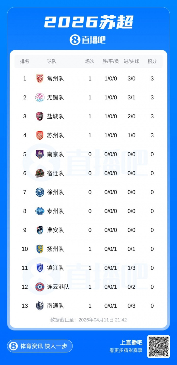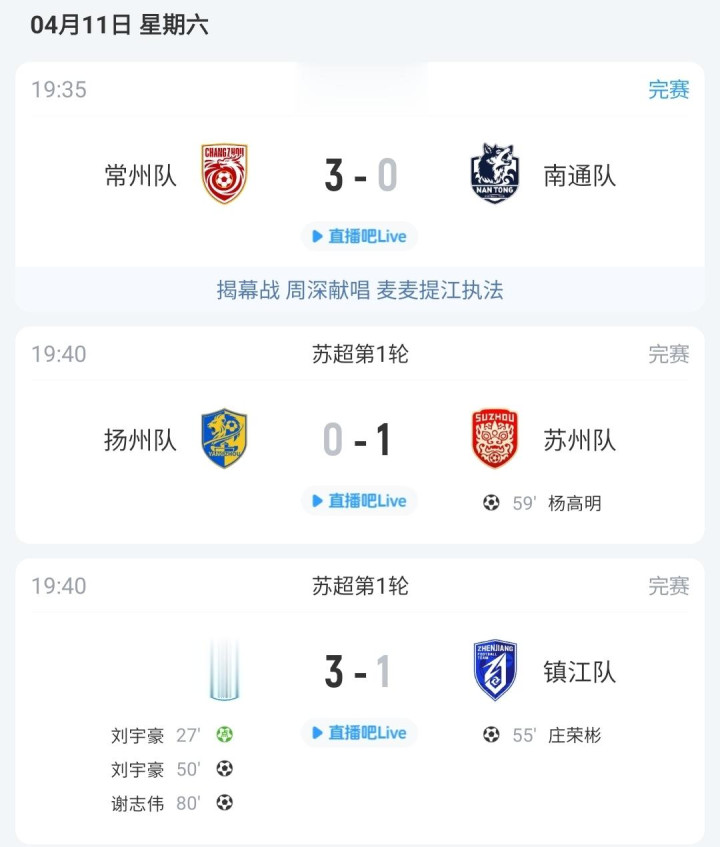 其中常州队3-0大捷上届亚军南通队,苏州队1-0打败扬州队,无锡队3-1打败镇江队。他们三队与盐城队一同领跑苏超。