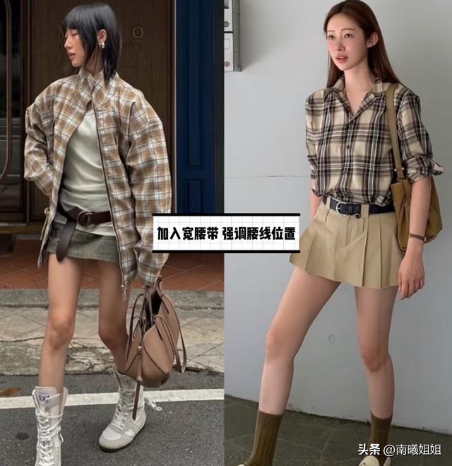 一件格子衬衫,就不错解锁N种穿法,单穿叠穿都很好意思!系上纽扣穿,提议挽起袖子,领子解开2颗纽扣,衣摆塞进裙腰,配短裙扎宽腰带,视觉上更显腿长。
