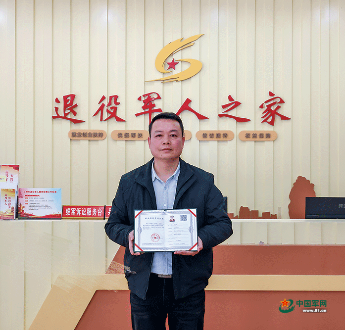 林佑雄手抓退役军东谈主事务员行状妙技等第文凭留影。郑银杰摄