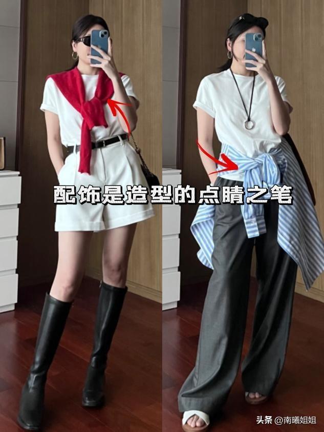 这是拉开差距最关节的一环。“不会打扮”的东说念主穿上白T恤后,频频仅仅简短地搭配一条裤子或裙子,忽略了腰线、配饰等细节的打造,导致举座造型平常无奇。“会打扮”的东说念主则擅长诈欺细节为造型加分。她们懂得“高腰线是生命线”,岂论是将T恤下摆塞进下装,依然诈欺腰带、斜挎包来强调腰线,都能片刻优化体魄比例,增强利落感。在配饰方面,她们撤职“少即是多”和“魄力合股”的原则,就能让基础白T变得很有作风。