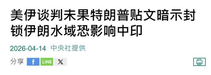 中央社提供2026-04-14好意思伊谈判未果特朗普贴文示意顽固伊朗水域恐影响中印