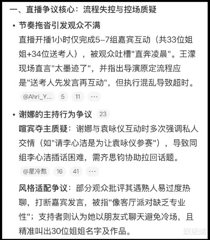 从王濛吐槽直播拖拉、到谢娜恢复引争议,再到粉丝怒怼节目组,看似零碎的话题,实则鼓胀指向节目组的处理问题——拉胯、不精心。