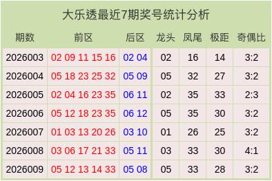 上期大乐透的开奖号码中,首尾组合为05+33,极距为28,奇偶比为3:2。