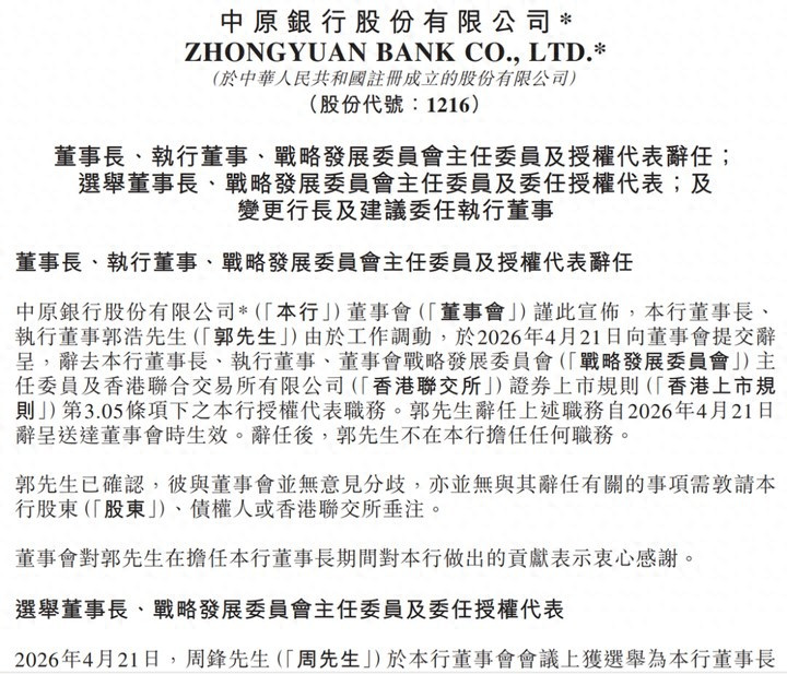 4月21日,华夏银行发布公告显露,董事长、行长双双换东谈主,董事长、实验董事郭浩当日提交辞呈,辞去华夏银行董事长、实验董事、董事会计谋发展委员会主任委员职务;认真履行行长职责尚未满半年的周锋升任董事长,新行长则由来自河南农商银行的张涛出任。公告提到,周锋任华夏银行董事长、张涛任行长的任职履历尚待河南金融监管局核准。